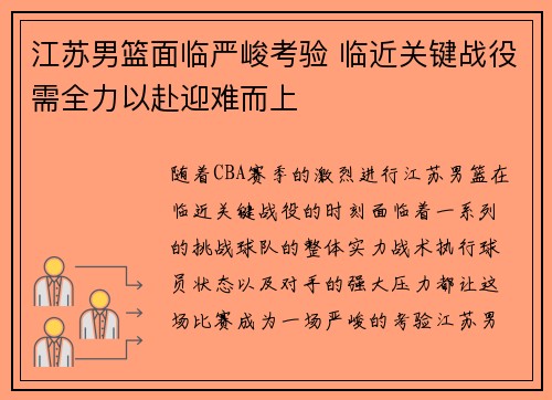 随着CBA赛季的激烈进行,江苏男篮在临近...