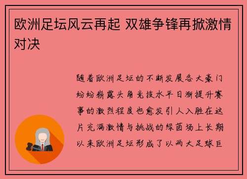 随着欧洲足坛的不断发展,各大豪门纷纷崭露...