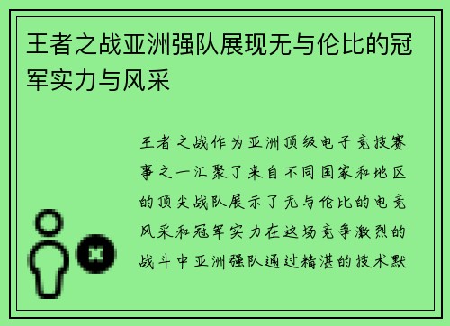 王者之战作为亚洲顶级电子竞技赛事之一,汇...