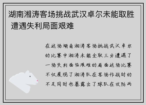 在这场湖南湘涛客场挑战武汉卓尔的比赛中,...